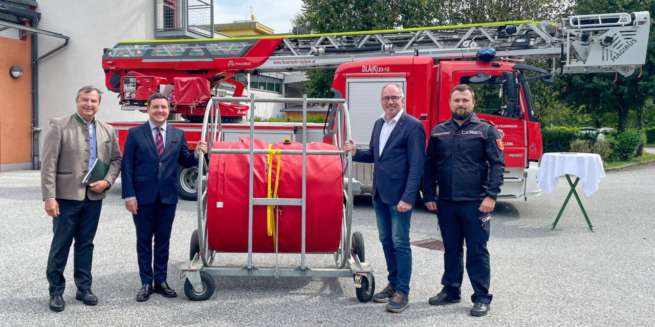 Bild: (v.l.) Stadtbaumeister Thomas Gätzschmann und Erster Bürgermeister Hans-Peter Dangschat bei der Vertragsunterzeichnung in Hallein mit Bürgermeister Alexander Stangassinger und dem Ortsfeuerwehrkommandanten der Feuerwehr Hallein, Sebastian Wass