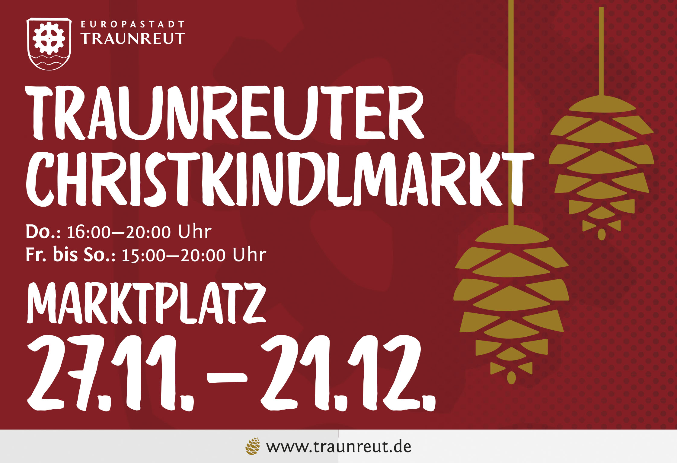 Vom 27. November bis zum 21. Dezember bietet der neu gestaltete Marktplatz an der Eichendorffstraße die Kulisse für den beliebten Traunreuter Christkindlmarkt. Auch heuer erwarten die Besucherinnen und Besucher wieder ein abwechslungsreiches Programm mit After-Work-Konzerten am Donnerstag sowie bunten Marktständen mit kulinarischen Köstlichkeiten und Kunsthandwerk aus der Region. Traditionell sind auch wieder Vertreter der Partnerstädte Lucé, Virovitica und Nettuno mit regionalen Spezialitäten dabei.