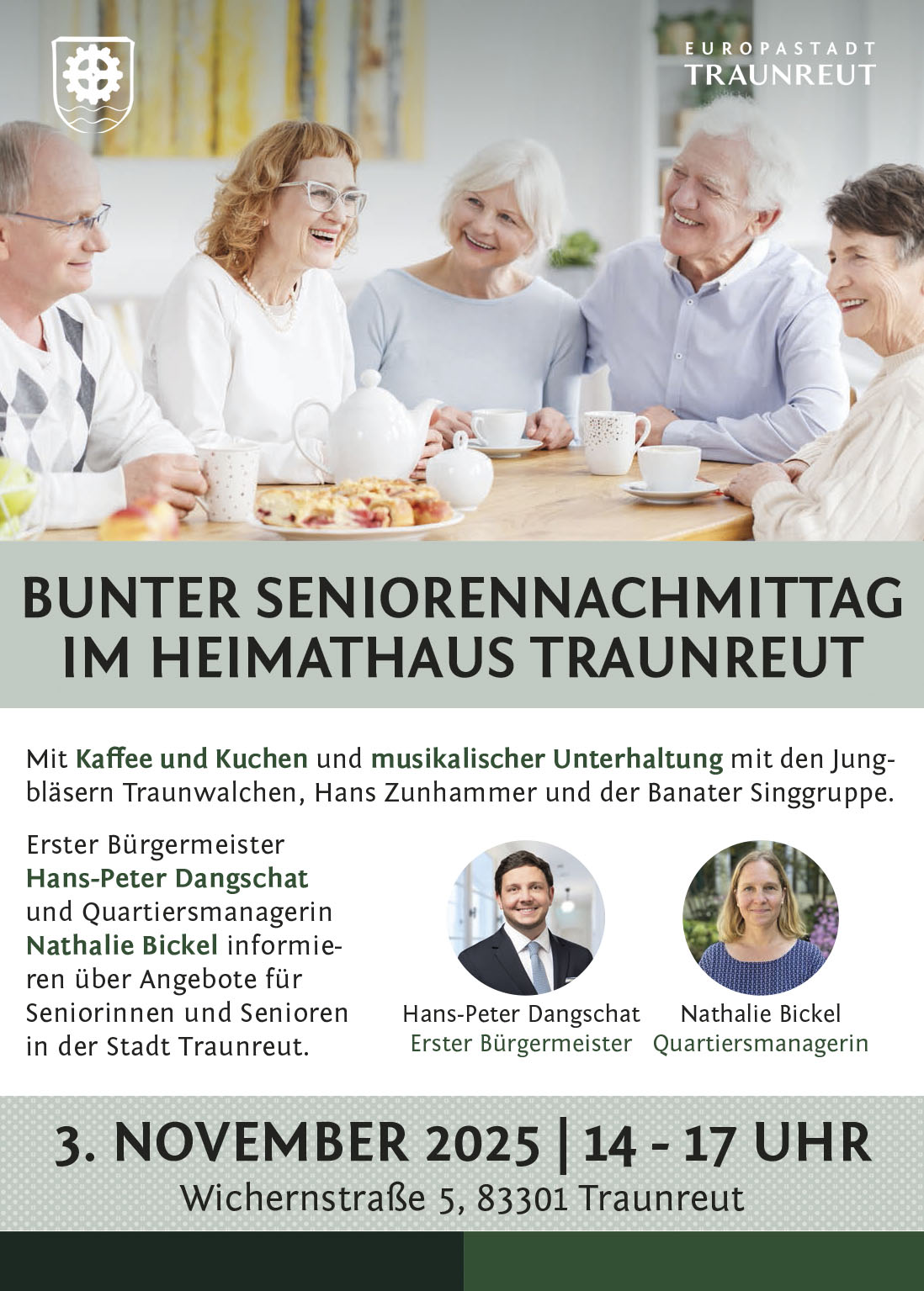 Am Montag, den 3. November 2025, lädt der Seniorenbeirat der Stadt Traunreut alle Seniorinnen und Senioren herzlich zum traditionellen Seniorennachmittag ins Heimathaus Traunreut ein. Die Veranstaltung beginnt um 14:00 Uhr und verspricht einen abwechslungsreichen und unterhaltsamen Nachmittag mit Musik, interessanten Vorträgen und gemütlichem Beisammensein.