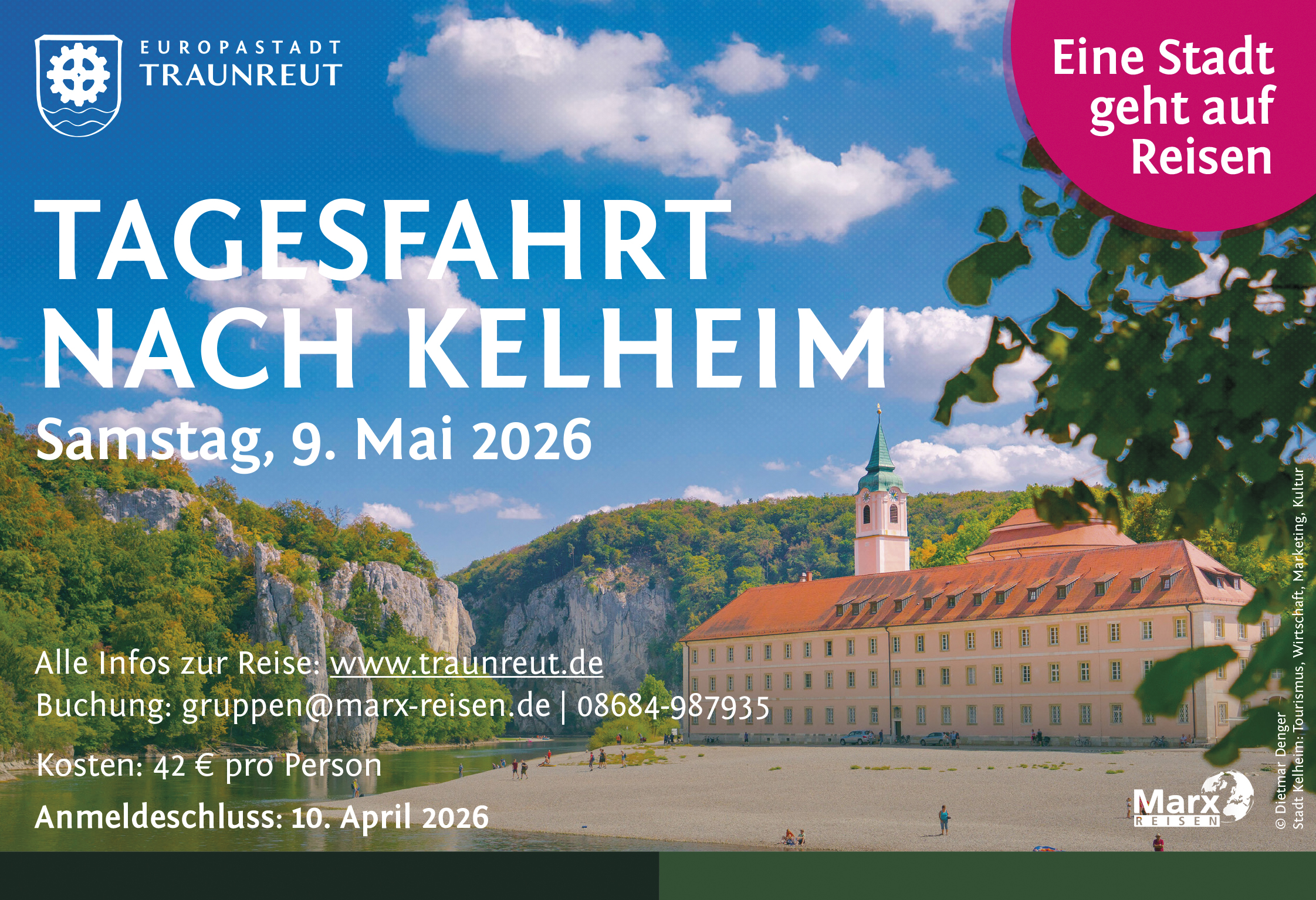 Am Samstag, 9. Mai, lädt die Stadt Traunreut erneut zu ihrer beliebten Ausflugsreihe „Eine Stadt geht auf Reisen“ ein. Ziel ist diesmal die Stadt Kelheim mit der imposanten Befreiungshalle, dem Kloster Weltenburg und dem Donaudurchbruch. Anmeldungen für die Fahrt sind jetzt möglich.