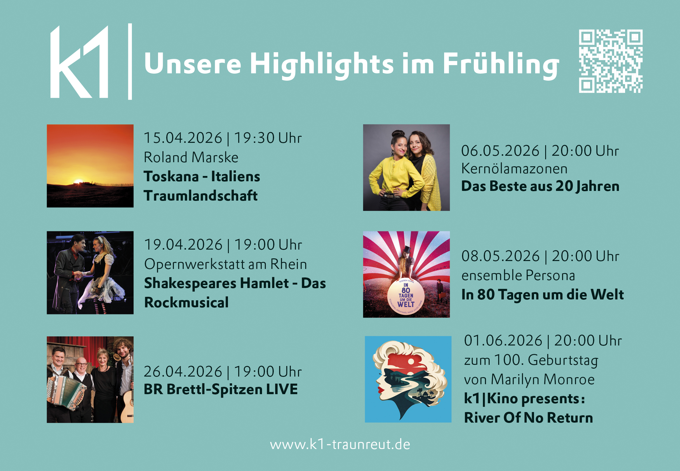 Tickets sind telefonisch unter +49 8669 857-444 oder direkt vor Ort im k1 erhältlich – jeweils von Dienstag bis Freitag zwischen 11:00 und 15:00 Uhr. Online-Buchungen sind jederzeit unter www.k1-traunreut.de möglich. Die Abendkasse öffnet in der Regel eine Stunde vor Veranstaltungsbeginn.